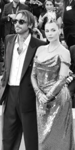 Rose Villain ha indossato un abito drappeggiato e corsettato in georgette metallizzata, interamente ricoperto di paillettes dorate, firmato Vivienne Westwood, un modello che richiama uno dei corsetti più iconici della maison, reso celebre nella sua versione bianca, spesso scelto anche come “abito da sposa”. Il twist? La versione dell’abito è color oro brillante, irradiando luce ad ogni passo.