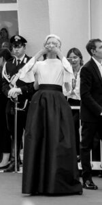 L’attrice britannica ha incantato il Lido indossando un raffinato abito bicolore firmato Chanel, composto da una blusa in seta bianca e una lunga gonna in mikado nero, un gioco di contrasti che ha esaltato la sua naturale eleganza e il suo stile inconfondibile, sospeso tra classicismo e sperimentazione.